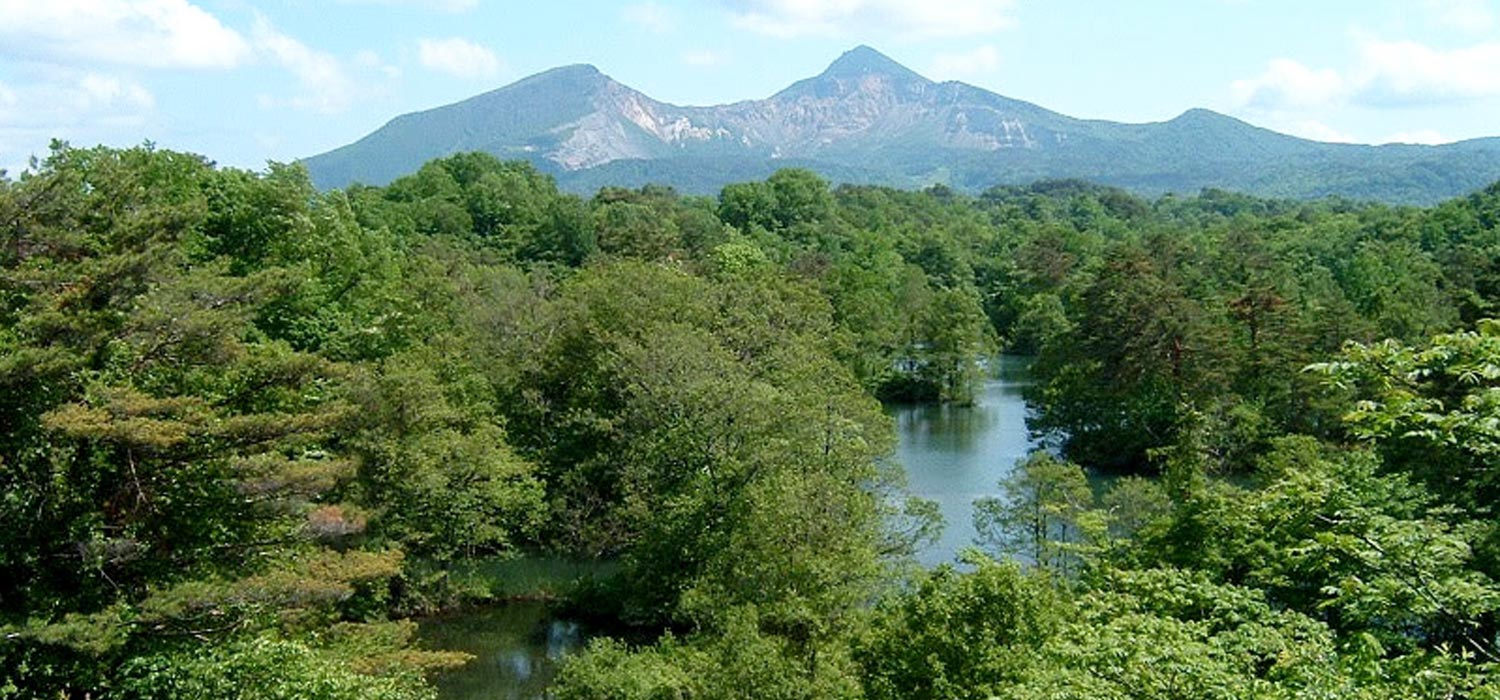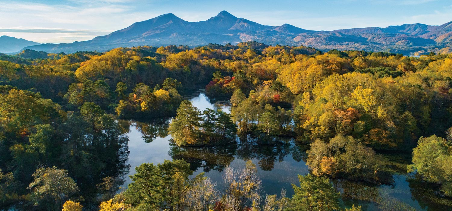 透き通る湖沼に浮かぶ広葉樹の森と、その奥にそびえる荒々しく雄大な磐梯山の姿で多くのカメラマンを魅了してきた中瀬沼展望台は、裏磐梯を代表するビューポイント。裏磐梯サイトステーションに車を停め、レンゲ沼を望む中瀬沼探勝路に入って一周約30分のコースです。道沿いには磐梯山の噴火によってできた「流れ山」と呼ばれる小さな丘も点在しています。路面や案内標識も整備されているので、珍しい高山植物や鳥のさえずりなどを楽しみながら散策することができます。