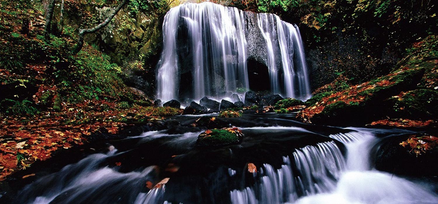 安達太良山系船明神山に水源をもつ不動川にかかる滝。駐車場から徒歩10分で森林浴を楽しみながら訪れることのできるビューポイントです。高さ10m、幅16mの黒い一枚岩に沿って勢いよく落ちる男滝(おだき)と、寄り添うように流れる女滝(めだき)。ふくしまの水三十選にも選定されており、ブナの原生林に囲まれた幻想的な、パワースポットとしても知られる滝です。