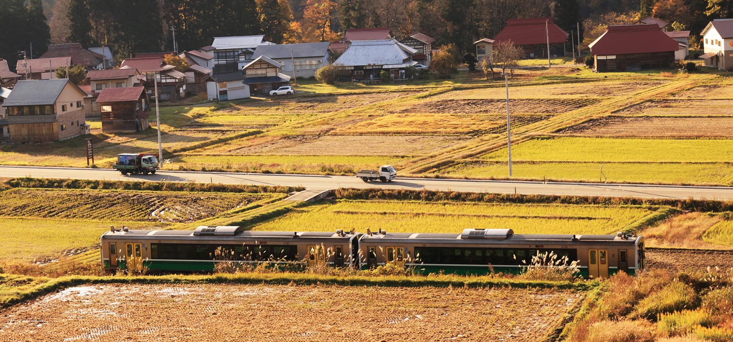 田園風景にぽつんと佇むノスタルジックな駅舎がとてもフォトジェニックな会津中川駅。春は桜や水鏡の田んぼ、夏は新緑やひまわり、秋は紅葉や黄金色の稲穂、冬は雪景色の中を只見線の列車が走るのどかな風景は更なる郷愁を誘います。徒歩10分の山の中腹からは駅近くの集落を見下ろすこともできます。