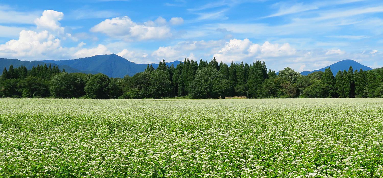 夏の終わり、約40ヘクタールの蕎麦畑一面に広がる爽やかな緑の葉と白い花。秋、収穫を終えた蕎麦の幹が紅葉する紅色の大地。会津の山に囲まれた蕎麦畑の可憐な白い花の絨毯。ロマンティックなカメラ女子にも人気のスポットです。見頃は8月下旬から9月上旬にかけて。